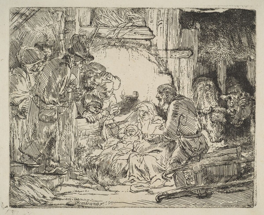 Etching, The Adoration of the Shepherds with Lamp, Rembrandt, ca. 1654, collection of The Metropolitan Museum of Art, New York.